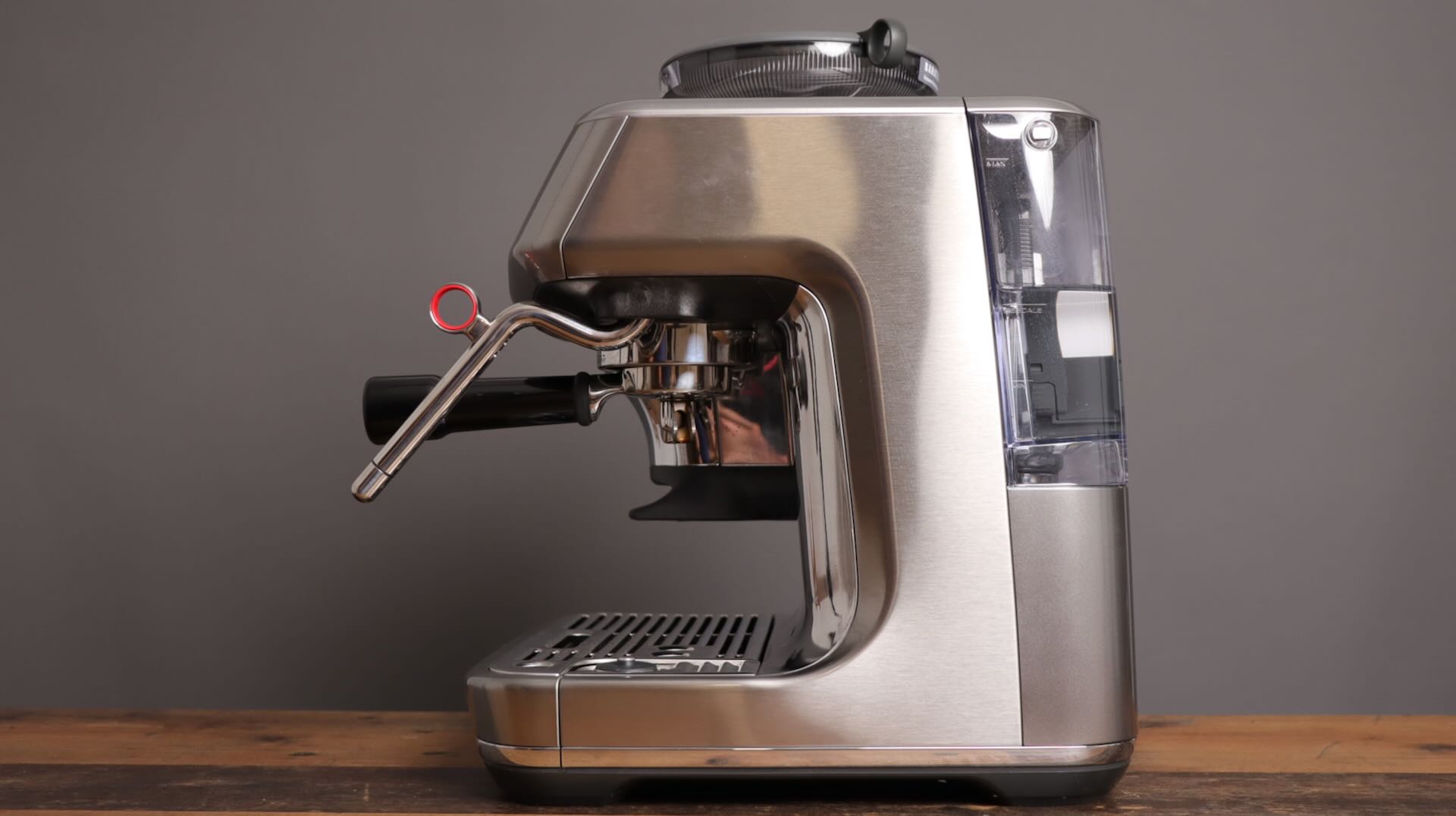 On the top, there is a smoke colored bean hopper with ample room for your beans (12 ounces worth). On the right side of the machine jettisons a well built steam wand, which may not articulate, but does provide a good angle for steaming. It has a cute little red pull tab, which adds a dab of color to an otherwise monotone machine.
