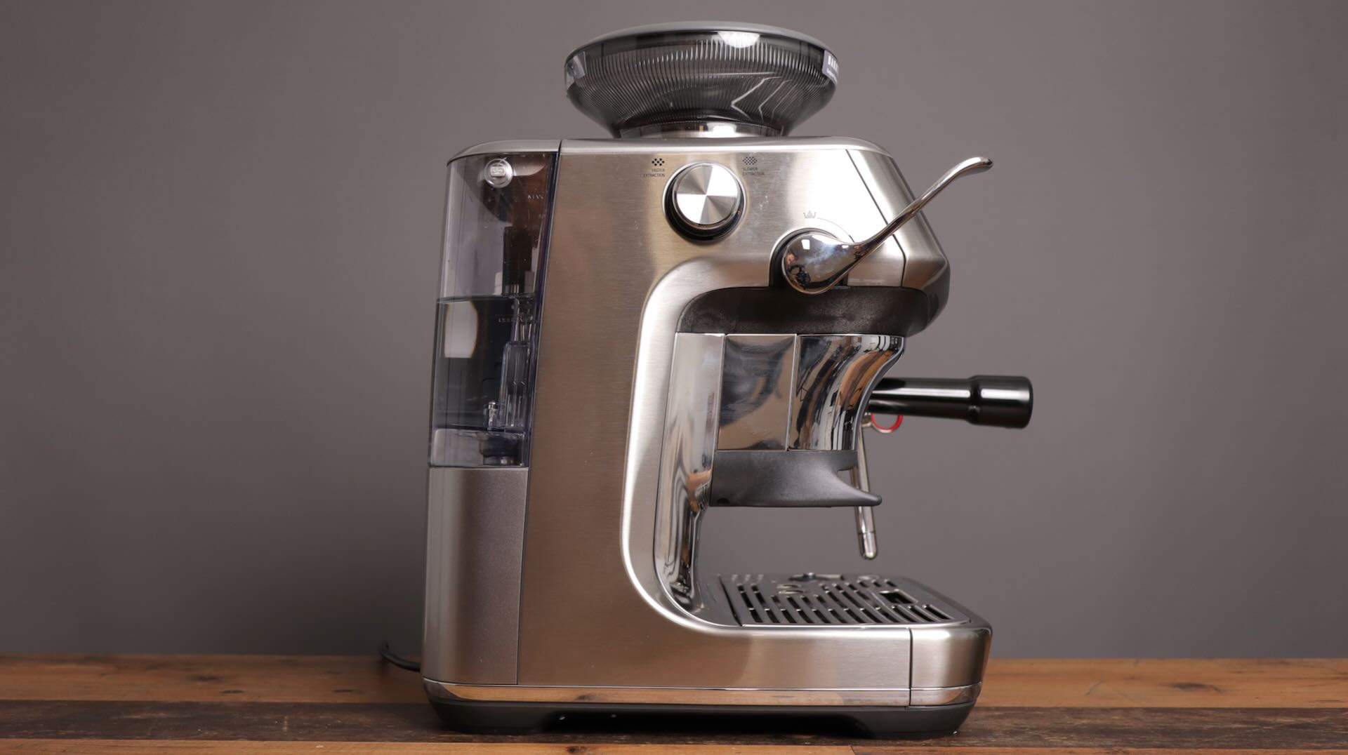 The left side of the Breville Barista Express Impress exemplifies the stepless grinder knob and integrated tamper lever