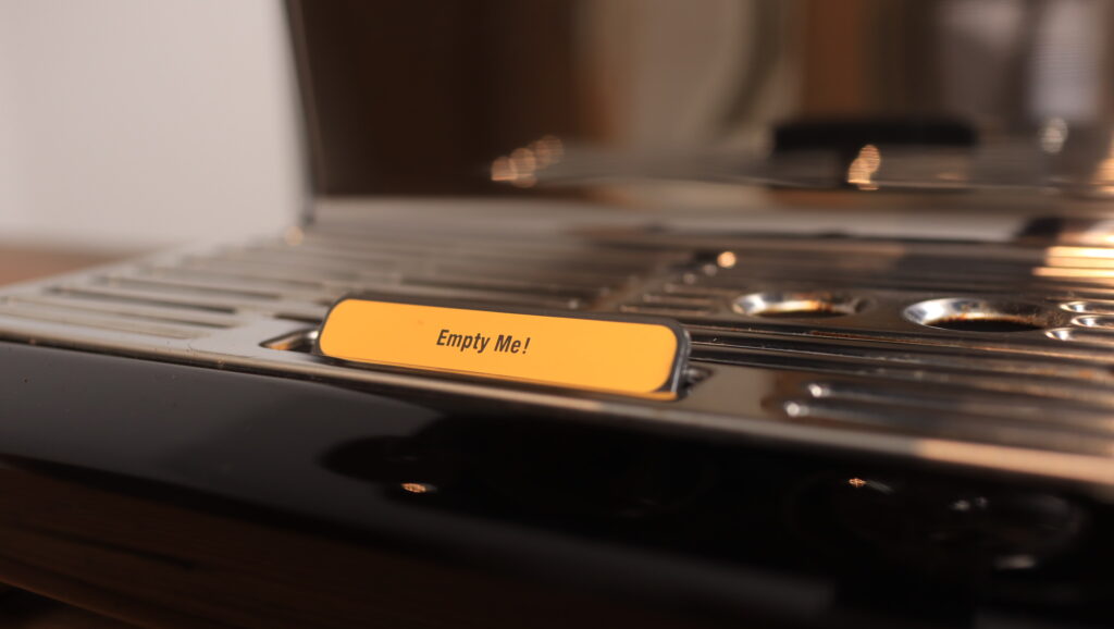 I always have to smile when I see what Breville has packed into its design. I love the fact that the included tamper is magnetic, and get sucked up into the machine housing, to be kept neat and tidy. The included milk frothing pitcher has a temperature scale on it, so you know how hot your milk is getting. Then, the included tools find their home in a little dish behind the drip tray. Finally, there is a pop up message that says “clean me!” when it’s time to empty the drip tray. And again, I love how the portafilter feels in the hands. It’s weighted as such, and formed so that it fits perfectly cradled in your hands.