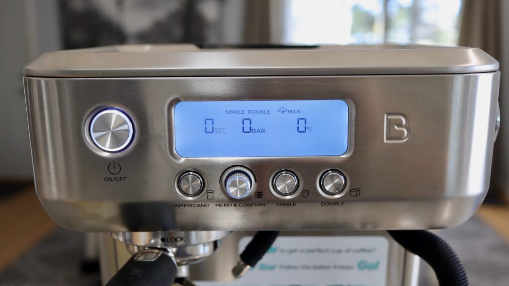 Below the control panel, you will see the 58mm brew group, which comes equipped with a dual spouted portafilter. To the right of the portafilter is a little water spout, and to the right of that is the steam wand.