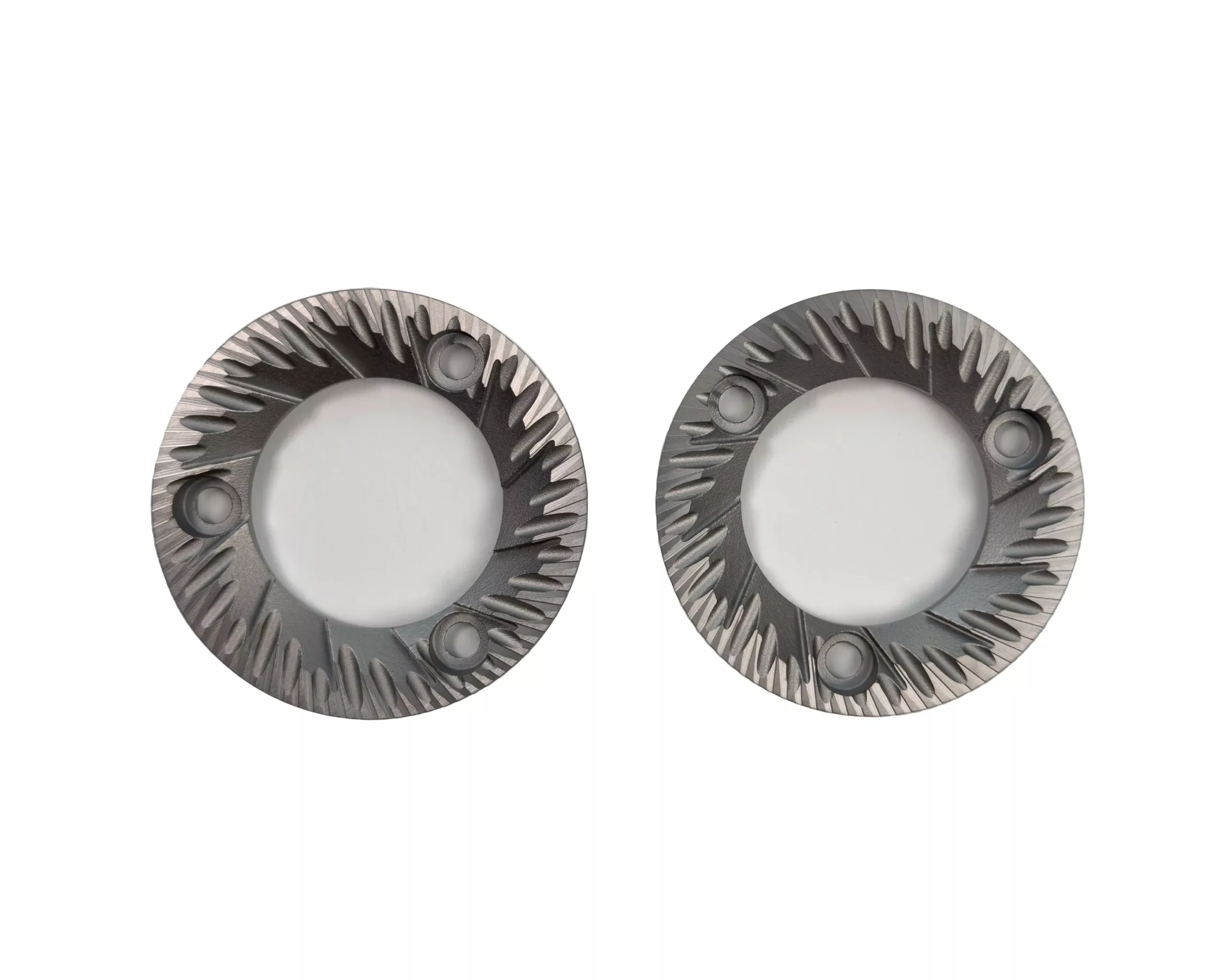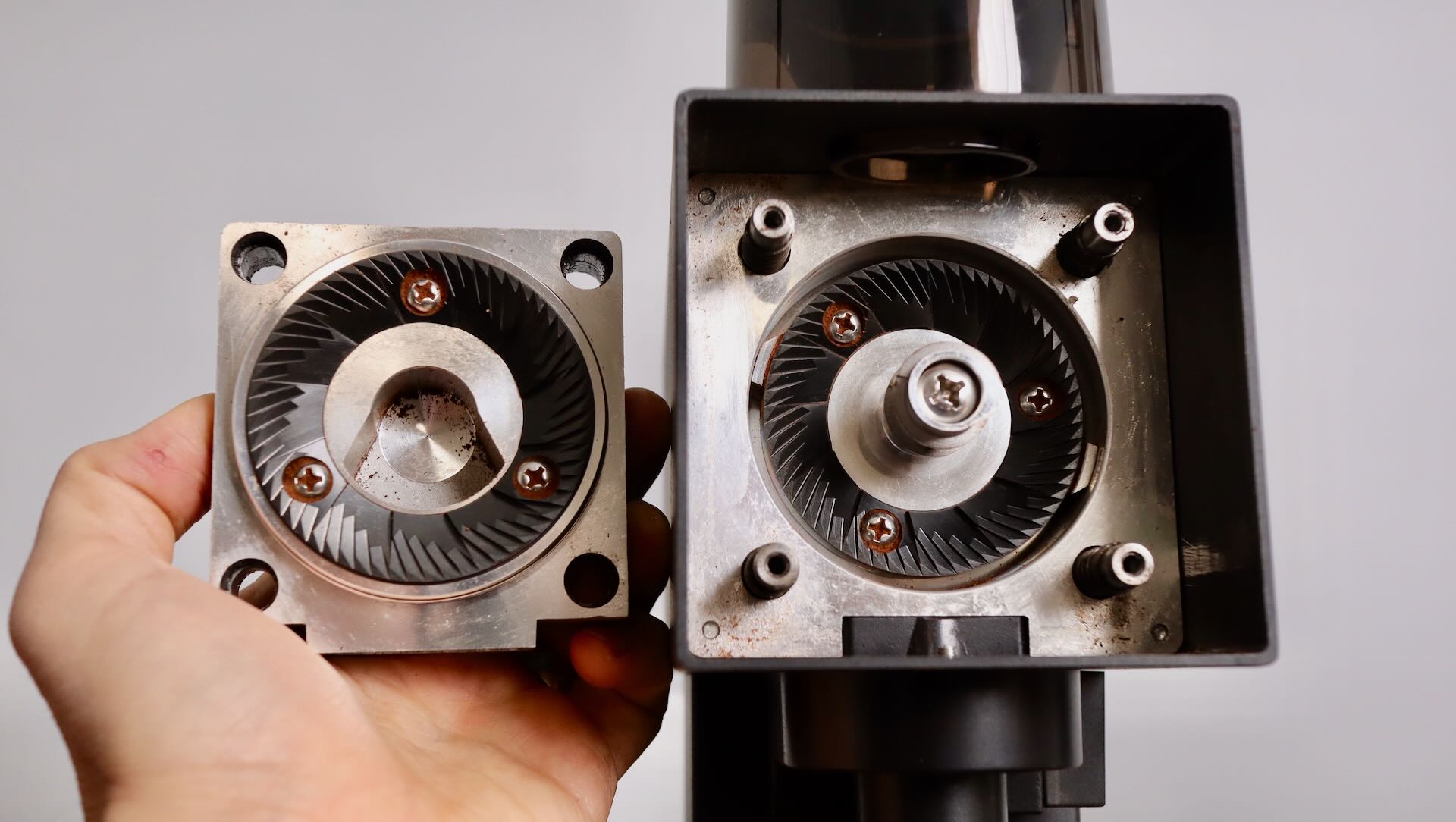 Looking at the burrs, these are a conventional 3 holed design, for attaching to the burr carriers. Their geometry shows some aggressive cutting angles, and relatively large pre-breaking hollows. These burrs are equipped with a DLC – “diamond like carbon” which is supposed to harden the burrs, reduce friction, and also reduce the static of the grounds.