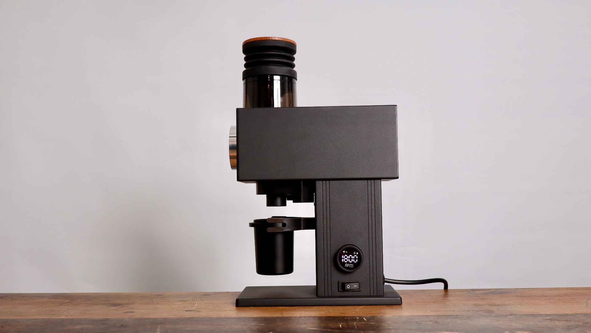 Moving upwards, another square element sits 90 degrees atop the vertical tower. This square houses the motor in the back, as well as the 64mm flat burrs and dial towards the front.