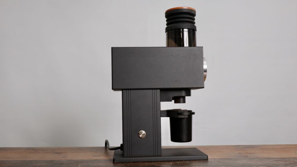 It includes a deionizer, to remove static from the grinds, and it’s got a baffle or bellows on the top, to be able to bang out the remaining coffee grounds into its held cup. It has a small footprint, and is on the affordable side, if you’re looking for a 64mm, vertically mounted and variable speed grinder.