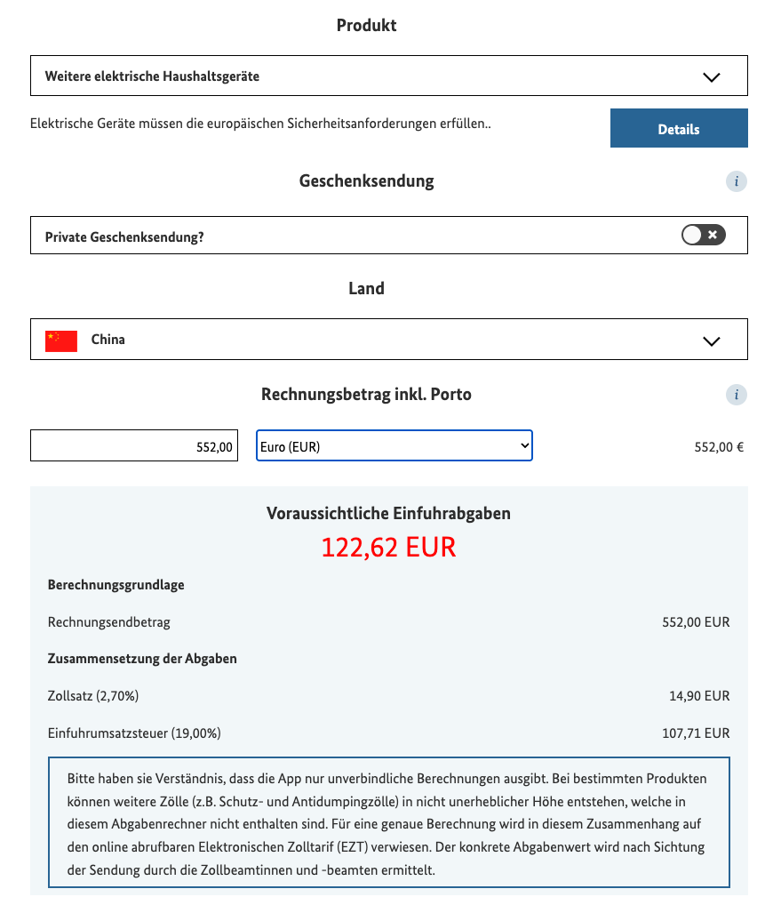 So in our example, import fees would come to another €122, bring the total to €674.