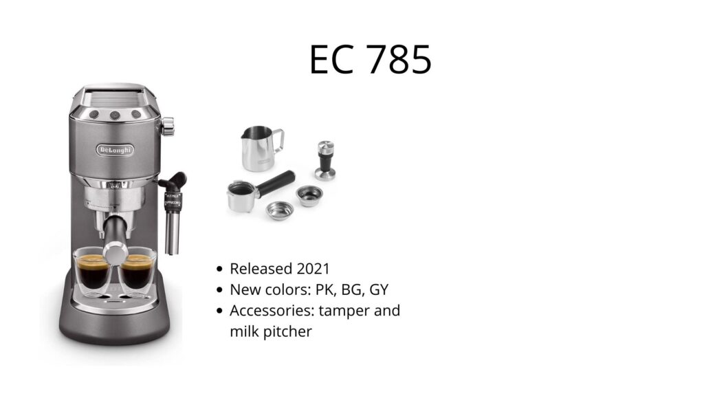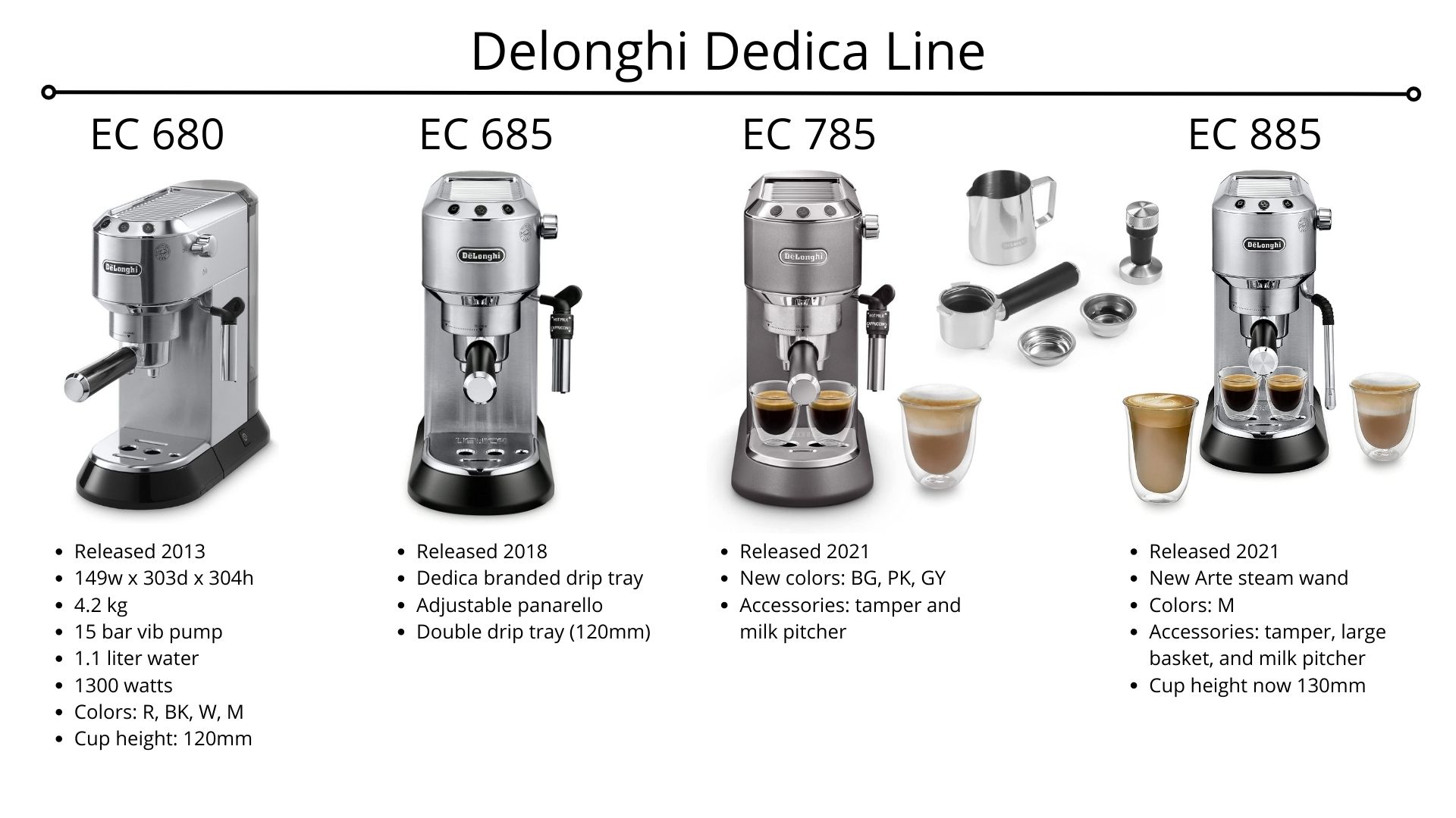 5 years after the release of the EC680 came the Dedica EC685. The main difference here is a “Dedica” branded drip tray, and a little drip tray underneath the main drip tray. Also, the steam wand panarello was updated to include two settings for either ‘hot milk’ or cappuccino. Additionally, the rubber nozzle under the panarello was elongated, making it easier to steam without the panarello, since you can get the nozzle down deeper into the milk.
