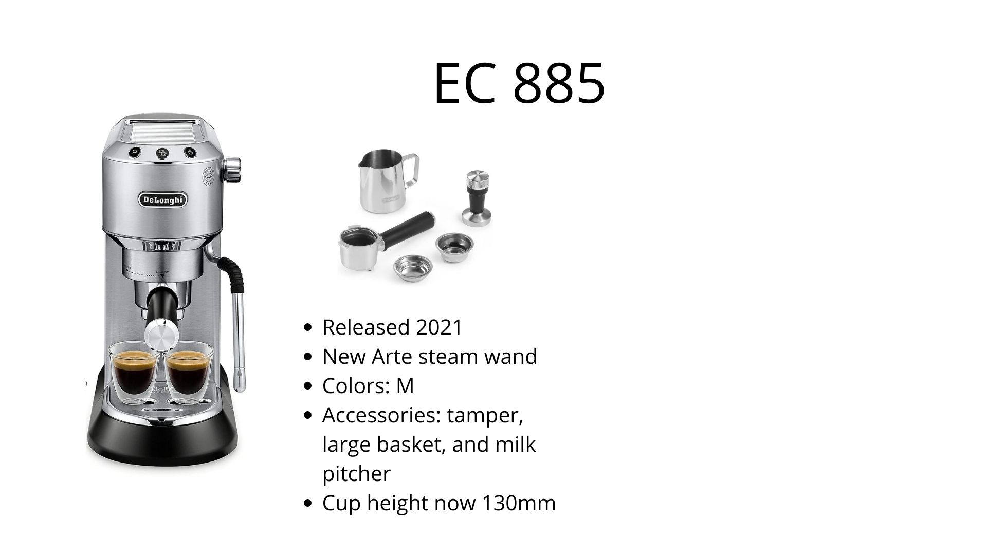 The Delonghi Dedica line provides very good espresso and milk foam, at a low price point. The small footprint, ease of use, and good looks also scores points. Whether you go for the original model, or an updated one, they all use the same thermoblock, brew group, volumetric dosing, and therefore all provide some very good espresso. You really cannot go wrong with any model. That being said, if you are buying for the first time, I would recommend going for the EC885.