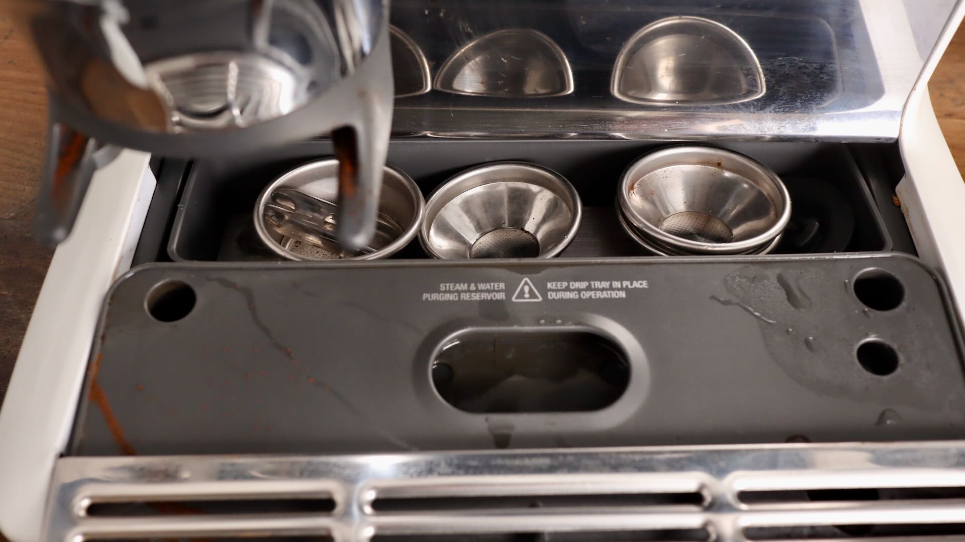 Something I’ve always appreciated about Breville are the unexpected niceties. For example, when you pull out the drip tray, a little storage bin comes out with it, where you can store your baskets, backflushing disk, and more. It’s a nice little feature, for sure.
