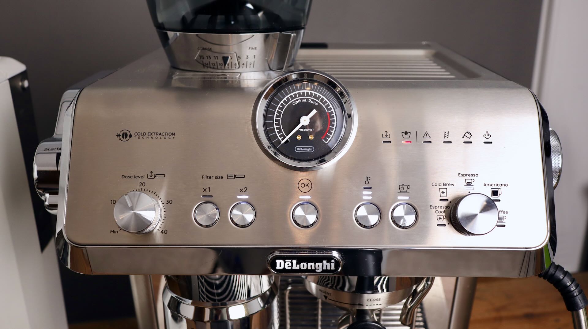The Breville just has two options, to either start a volumetric extraction for a 1 cup or 2 cup espresso. So, it’s pretty basic in that regard, although it works well. What the Barista Express line does however incorporate is adjustable pre-infusion. The setting of pre-infusion is something left out entirely by Delonghi.