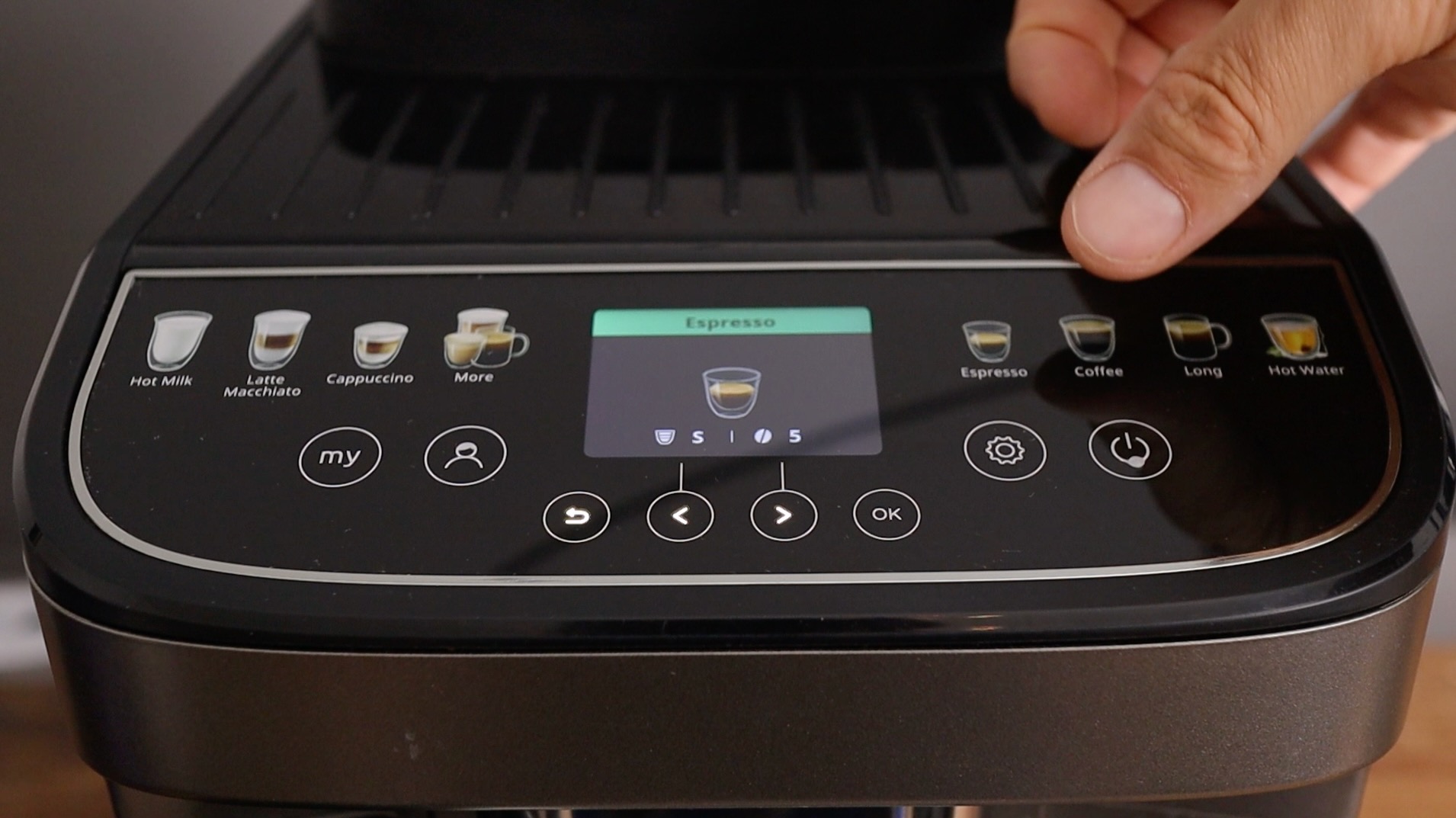 Setting the bean amount is really easy. First, just choose a drink, such as Espresso. Then, use the buttons below the screen to set the number of beans. I normally choose 5 beans, to get the most intense drink possible.