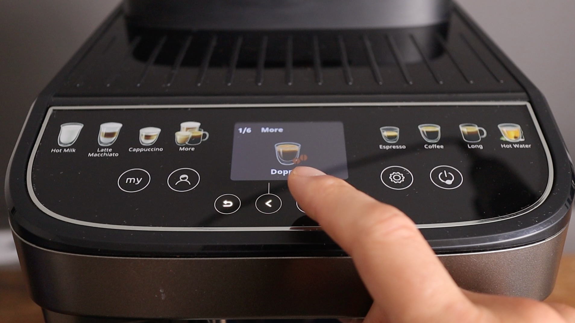 The Magnifica Evo Next’s main feature is probably its HMI screen. From the screen, you can choose between 13 different drinks, from Hot Milk, to Cappuccino, to Espresso, Coffee Crema, Long, and more. The Doppio+ is my favorite espresso option, because it gives me the strongest drink. I also really like the Coffee (Crema).