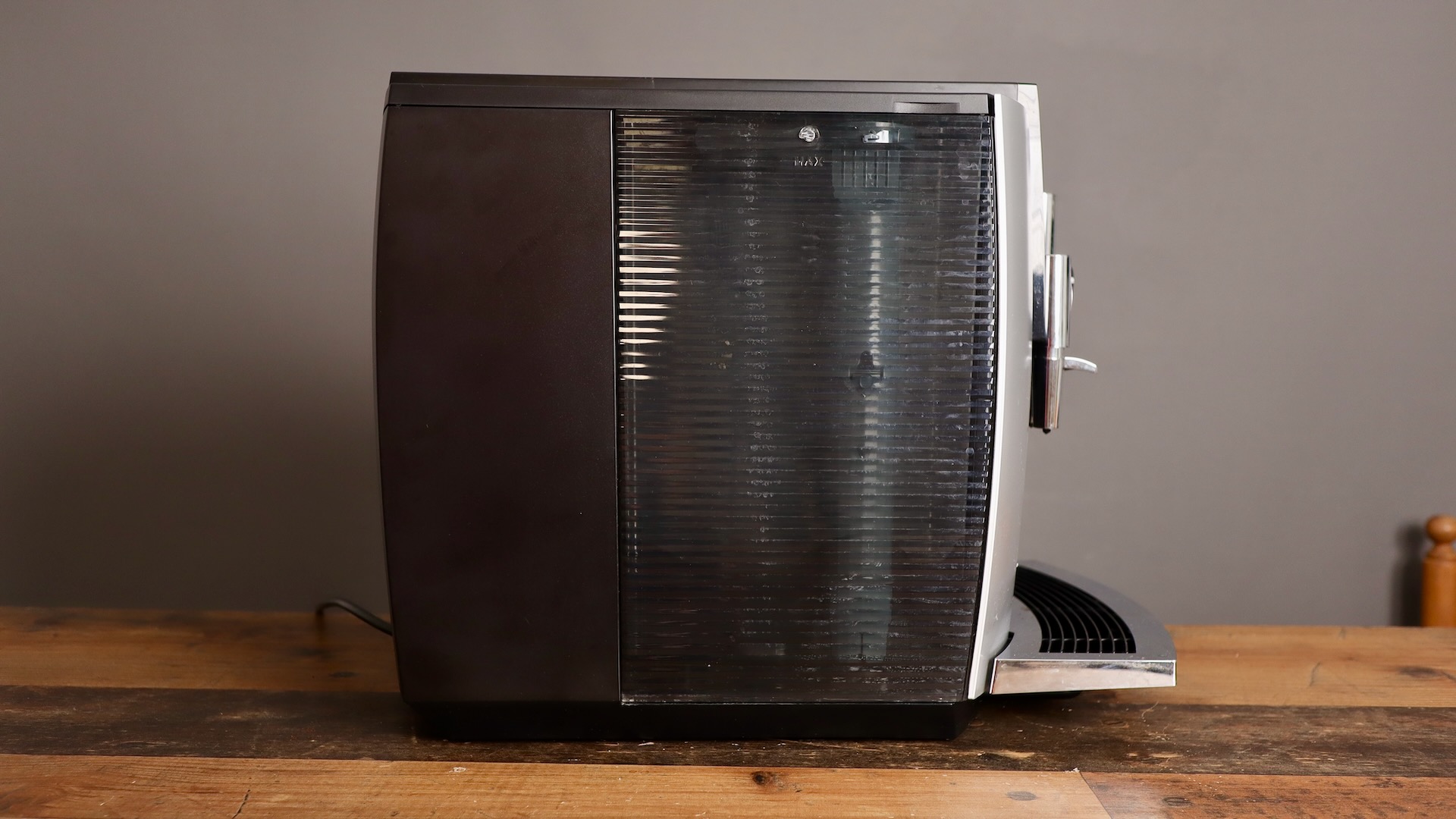 Having a look from the left side, we can see a litte more design inspiration. This is where the water tank lives, which admittedly is a nice design. Again, you see here the bowed left and right sides, and the water tank with its ribbed and transparent aesthetics provides a nice contrast to the black panel behind it, and light gray panel towards the front.