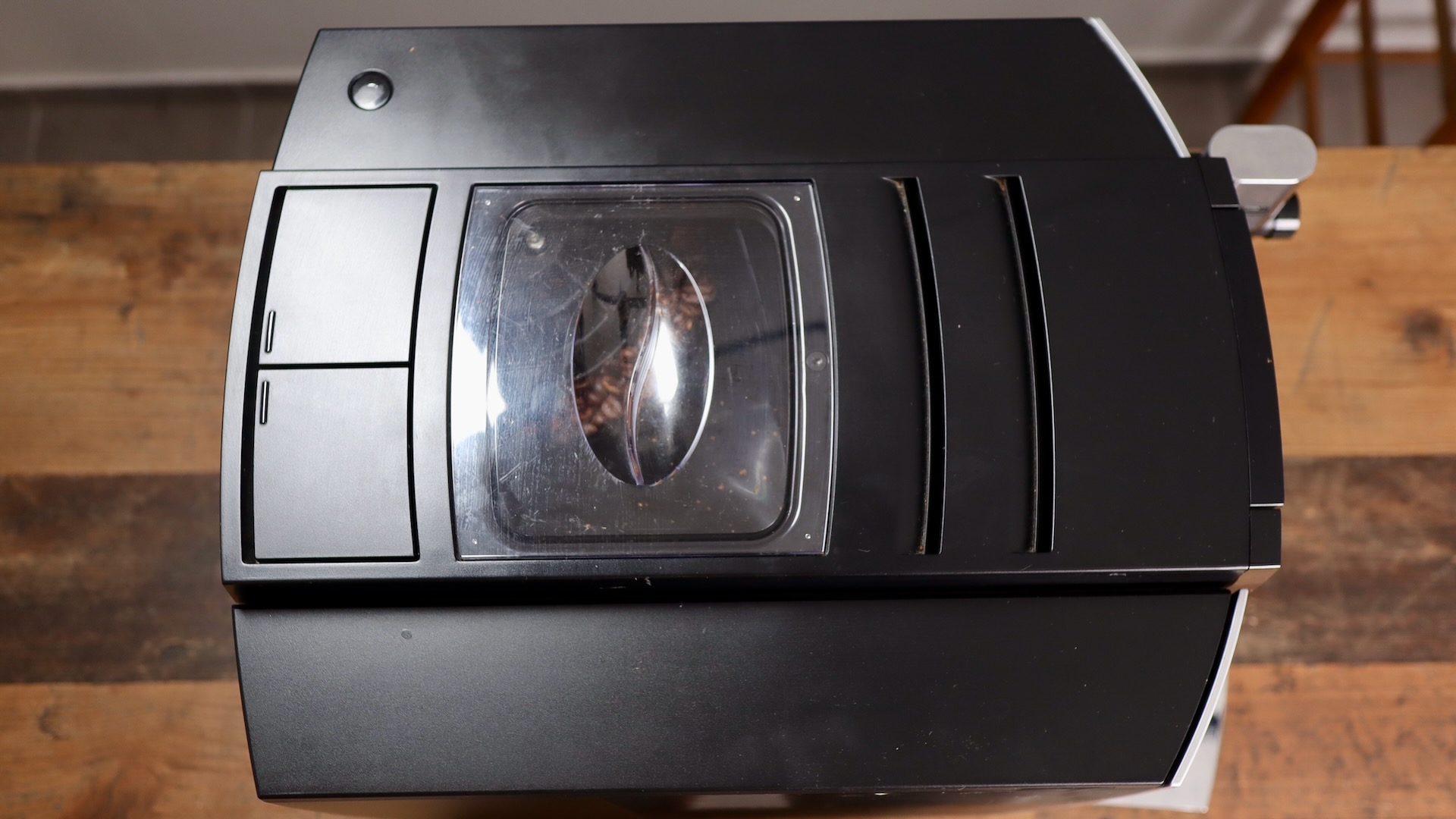 Bean hopper and pre-ground chute on the Jura E8 espresso machine